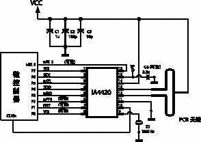 图2是IA4420的典型应用原理图,可做为无线双向防盗系统的参考电路,主要包括一个IA4420芯片和单片机(编解码器)。从图中可以看到,该电路的外围元件少,仅有一个基准晶体及几个无源器件,没有调试部件,天线用微带天线直接设计在线路板上,这给研制及生产带来了极大的方便。无需电感等元器件,晶体X1需要用高稳定晶体,电容选用高稳定贴片元件,如NPO高稳定电容,以确保性能稳定。该电路采用跳频发射,将可靠性提高了3倍。