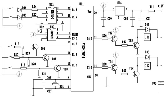 ① 图中C09为稳定单片机电源电压用,由于自动窗驱动用直流电机电流较大,启动电流达8A,为正常工作时电流的3倍。因此电机启动时变压器电压下降严重,用示波器观察可以看到电压有过零现象。电容C01电容难以补偿电压的瞬时不足,7805的输出电压受到输入不足的影响,此时IMP813L电压将低于5V,当低于4.3V时,将发出复位信号,使单片机复位,从而造成工作不稳定现象,继电器吸合后立即断开。增加较大的电容C09可以解决这一问题。