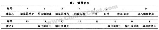由于SHCAN2000智能仪表处于正常运行状态时,在串行口上只有键盘/显示器向SHCAN2000智能仪表发送键状态的变化。因此,SHCAN2000智能仪表规定:主动向SHCAN2000智能仪表传送的数据只有一种.那就是键状态的变化。其数据格式如表1所列。其中键号的定义如表2所列。