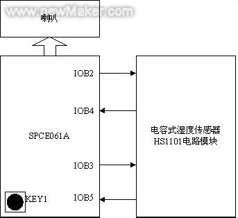 对于湿度测量仪,除了具有一个控制器控制测量外,还需要测量器。本系统中采用SPCE061A作为控制器,电容式湿度传感器HS1101作为测量器,利用一个按键来启动湿度测量和语音播放。由于电容不能直接和SPCE061A的I/O口连接进行测量,所以需要一个电路模块,与SPCE061A的Feedback接口IOB2、IOB4,IOB3、IOB5连接,实现从电容到频率的转换,系统的结构框图如图 2.1。