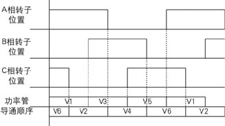 图2是无刷直流电机转速控制系统的主电路图,图3是转子位置及换相关系图。对应不同的转子位置,主桥臂的6个管子每次只有2个是开通的。