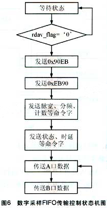 在数字采样的FIFO传输时,为了后端信号处理得方便,可在每帧数据上附加帧头:“0x90EB EB90”,这样可以明确表明帧的起始位置,防止错误数据影响后端信号的处理流程,这些信号的脉宽、分频、计数命令和状态、时延命令都是16bit的,均可在两个时钟周期内传输完毕,并可用于表明数据传输和雷达工作的状态。