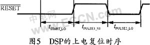 该DSP上电后正常复位时,低电平持续时间必须大于100个系统时钟周期。本系统采用Altera公司的FPGA EPlK100来产生上电复位波形和时序控制。由于EPlK100需要一个配置芯片,而且它和DSP存在一个上电先后的问题。也就是说,在上电后,如果FPGA芯片在进行配置文件的读入时,DSP上电仍未稳定,则应充分延长tstart_LO的低电平时间,以避免上电未稳定而FPGA上的波形已经结束。因此,应保证DSP上电稳定先于FPGA芯片配置文件的读入,此问题在系统设计时应予以充分重视,否则DSP将无法正常工作。