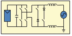 无变压器的DC/AC逆变器在欧洲广泛应用,但是在美国,这种产品只是最近才在某些地区被使用。无变压器的逆变器拓扑结构有很多种,而 Fraunhofer研究所开发的HERIC拓扑表现出了很高的效率。传统的全桥逆变器的结构如图1所示,HERIC拓扑如图2所示,此图中还显示了两种新的开关/二极管对。这种拓扑利用独有的续流路径来减小开关和导通损耗,使效率提升到98%以上。
