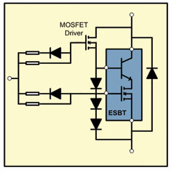 ST公司的射极开关式双极型二极管(ESBT)提供了很好的解决方案。如图3所示,ESBT的共基极放大器结构中包含了一个高压 BJT和一个功率MOSFET,整个器件有非常低的导通电压降。