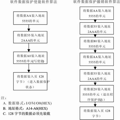 AT29C010A具有软件控制数据保护的特性,这一特性在ATMEL公司出厂时没有开启,用户可根据需要开启或关闭。一旦开启,在未执行关闭指令之前这一特性始终有效;供电情况的改变不会重新设置这一特性,但需警惕在供电情况改变时随机的编程周期可能改变这一特性。若要开启软件数据保护,必须执行三条针对存放有特殊数据的特殊地址单元的程序指令。当开启软件数据保护之后,所需的程序若要出现,也必须执行同样的三条程序指令。软件保护使能的软件算法必须在程序可能执行之前发送到AT29C010A,所有的软件程序指令要按照分区程序的时序要求进行。在给出软件数据保护的指令代码之后便可进行字节的装载。图2给出了软件数据保护使能或撤销软件算法的流程图。