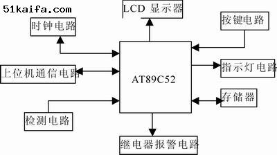 下面介绍用AT29C010A作为工业智能检测仪器存储器的一个实际应用,主要用AT29C010A来存储一级汉字库汉字部分、单片机采集处理的数据和仪器设定的一些参数。该仪器采用AT89C52作为中央处理器,AT29C010A作为存储器,74HC373作为地址锁存器,点阵式LCD显示器用作显示图形和字符,X1203作为实时时钟;另外,还有上位机通信电路,继电器报警电路,按键操作电路、指示灯电路及检测电路等。图3为工业智能检测仪器框图。