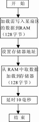 读取数据过程类似于普通E2PROM。但在写入(编程)时,它和普通 E2PROM不同,AT29C010A是采用按扇区编程,每个扇区大小为128个字节。由于每次写入数据时,整个扇区数据都将重写,因此必须采用数据缓冲区来存放要写入的数据(包括该扇区内已存在的数据)。在此应用实例中,采用AT89C52作中央处理器,它具有256字节内部数据存储器(RAM),用其中128字节(80H_FFH)RAM作为数据缓冲区存放要写入的数据。图5为数据写入流程图。