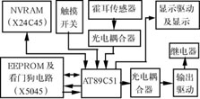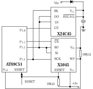 如脉冲状态数累计值、当前的状态等输入参数是需要掉电保护的,本系统中采用Xicor公司生产的X24C45。它是串行256位NVRAM,按16×16组织,包括一个256位的SRAM和一个256位的EEPROM,并且RAM和EEPROM阵列位对位重叠,上电时数据可自动从EEPROM调到SRAM中。X24C45还具有自动存储特性,即系统正常工作时,数据放在SRAM中,掉电时数据自动保存到EEPROM中。本系统中X24C45、X5045与AT89C51的接口如图2所示。