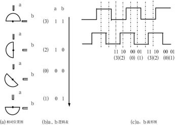 通过测量刀架蜗杆转过的角度来间接测量剪毛刀架高度(如一种典型产品类型为:蜗杆转过20转,剪毛刀架升或降1mm)。在刀架蜗杆上安装一半圆凸轮,同时相对垂直地安装一对霍耳传感器a、b。当凸轮金属部分接近霍耳传感器时,传感器输出为“1”;当凸轮金属部分远离传感器时,其输出为“0”。由于a、b正交,所以不仅可测量蜗杆转过的转数,还可以判断电动机目前是正转还是反转。刀架蜗杆逆时针转一圈,凸轮与a、b霍耳传感器相对位置、ab输出逻辑表、波形如图3所示;顺时针时情况如图4所示。a、b霍耳传感器输出通过光电耦合器送至单片机。