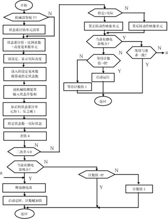 由前图3、图4可见逆时针时,a、b逻辑表顺序为3,2,0,1,...,顺时针时顺序为3,1,0,2,...。因此在存储器中,设置一表格。将本次读入的a、b状态及上次读入的a、b状态与表格相比较,即可判断出当前电动机的转向;从波形图还可以看出,a、b状态改变一次对应蜗杆转过90°(即1/4周),由此及产品类型号即可换算出脉冲状态数与剪毛刀架实际高度之间的比例系数。