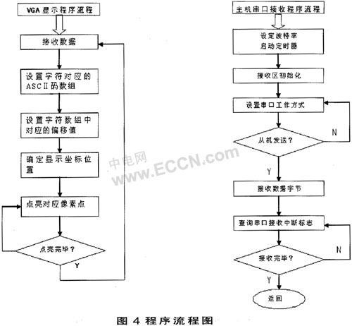 由SOPC Builder构建成的硬件系统首先必须下载到FPGA中,在FPGA上生成对应外设的引脚,然后才能够通过IDE烧程序给外设,使外设可以正常的运行。也就是说对主程序部分必须要在IDE模式下进行调试,这是整个过程中感觉效率比较低的地方,每次修改的程序都必须通过再次运行Run As Hardware重新编译才能写入硬件中,造成调试进度很慢。程序可以在SRAM或SDRAM上运行。为了保证断电后数据不丢失,采用FLASH Programmer把数据写入FLASH,然后把CPU的ResetAddress地址指向FLASH。通电后系统会自动对FPGA进行配置,并运行内部程序。该部分的程序主要是设置多个串口通信的时序以及VGA显示的内容。程序流程图如图4所示。