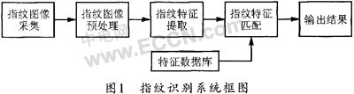 一般的指纹识别系统主要由指纹采集模块、系统核心模块、数据存储模块和输出显示模块等几部分组成。其系统硬件结构框图如图2所示。