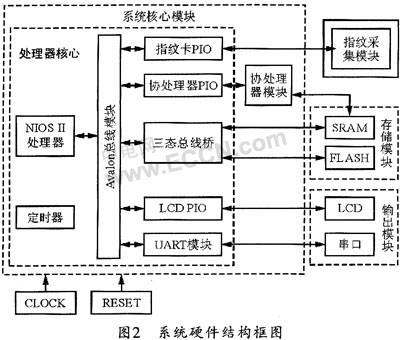 本系统的核心模块是在ALTERA公司的Cy-clone II 2C35上实现的,相应的软件开发套件包括Quartus II 5.0和NIOS II 5.0集成开发环境(IDE)。Cyclone II系列FPGA是ALTERA公司最新推出的低成本、高性价比的通刚FPGA,CycloneII 2C35具有32,216个LE单元、105个M4K RAM块、35个嵌入式乘法器,完全可以满足系统的性能要求。通过QuartusII中的软件工具SOPC Builder可实现NIOS II处理器的创建和各种IP模块的管理和配置,以构建系统的核心模块。图2中,根据系统的实际要求由SOPC Builder配置的处理器核心包括NIOS II处理器、指纹卡PIO、协处理器PIO、Avalon Tri-Atate Bridge、UART模块和LCD PIO等模块。配置好这些模块后,便可进行系统生成。SOPC Builder在系统生成过程中可生成HDL源文件和BDF文件。SOPC Builder为定制的NIOS II核心模块创建的一个符号(Symbol)就存放在BDF文件中,用户可以在Quartus软件中使用该符号。本系统核心模块是使用Quartus的符号表文件编译生成的。