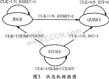 由于系统每次采集的指纹图像数据量达几十KB,故在系统核心模块中集成了一个硬逻辑协处理器。这个协处理器负责查询指纹芯片的状态和指纹图像数据采集存储任务。该协处理器是用硬件描述语言设计的一个有限状态机,其状态机模型如图3所示。系统复位后,协处理器将进入空闲状态并等待主处理器的复位信号;当正确接收到主处理器的复位信号后,协处理器进入查询状态;查询状态主要查询指纹芯片的中断状态位,当查询到有效中断状态位后,系统将进人数据采集存储状态;在数据采集存储状态,协处理器从指纹芯片读出数据并保存在系统的存储区SRAM中,读完整个指纹图像后即向NIOS II处理器发出中断信号并重新进入空闲状态,以等待主处理器复位。