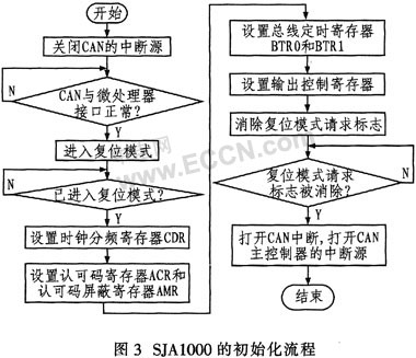 CAN总线通信的软件设计主要包括CAN的初始化程序、报文发送程序和报文接收程序等。在Basic CAN模式下,CAN初始化必须在复位模式下进行,所作的工作主要是设置时钟分频寄存器CDR、认可码寄存器ACR与认可码屏蔽寄存器AMR、总线定时寄存器BTR0和BTR1、输出控制寄存器OCR。根据课题要求,可以得出初始化后各寄存器所赋初值:CDR为0x08H;应用系统节点只接收ID(标志符)高八位为"10101010"的消息,认可码屏蔽寄存器不屏蔽,所以ACR=0xaaH,AMR=0x00H;系统中晶体频率为16 MHz,波特率预设值BRP=9,算出系统波特率为100 kb/s,BTRO=0C9H,BTR1=0A3H;位序流在正常输出模式下输出,采用上拉驱动方式,则OCR=0xAA。SJA1000初始化流程如图3所示。