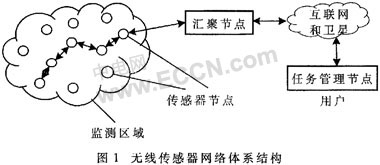 图1给出了一个典型的无线传感器网络的结构。这个网络由传感器节点、汇聚节点(sink)、Internet或通信卫星、任务管理节点等部分构成。传感器节点散布在指定的感知区域内,每个节点都可以收集数据,并通过“多跳”路由方式把数据传送到Sink。Sink也可以用同样的方式将信息发送给各节点。Sink直接与Internet或通信卫星相连(也可直接与监控主机相连),通过Internet或通信卫星实现任务管理节点(即观察者)与传感器之间的通信。