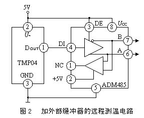 进行远程测温时,TMP03/04远优于模拟输出式温度传感器。这是因为它输出的是数字信号,比模 拟信号的抗干扰能力强。远程传输信号时不得影响t 1/t2的比率,必要时还可加1片ADM485型RS-485 差分线驱动器,电路如 图 2 所示。该电路能准确传输1200 m远的温度信号。ADM485中的发射器和接收器所造成的滞后时间误差仅为5 ns,不会影响t1、t2 值。在RS-485总线上可以接32片ADM485。