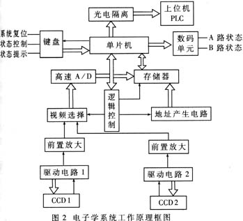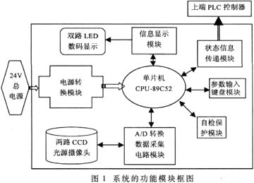 双路CCD高精度线纹测量实时监控系统主要由双路CCD摄像头及光源和电路箱等几部分组成,系统的功能模块框图如图1所示。