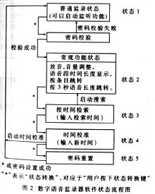 程序共有五个工作状态,通常处于"普通监录状态",可以进行监听,以确保系统正常工作。进入其它四个状态之前需要校验密码,所以只有掌握密码的管理人员才有权查找和播放所存储的语音内容。软件不设录音命令,但其它功能,如监录、音量增减、按条目或3秒钟长度向前跳转、向后跳转、按时间检索、密码重置等等都单设一条命令,在DSP程序中对应于不同的程序模块。此外,DSP程序中还含有语音编码和语音解码两大模块,由DSP主程序调用。