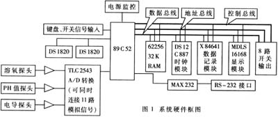 主控制芯片选用ATMEL公司的89C52。系统主要组成部分包括:传感器、信号调理部分、单片机、非易失EEPROM、模/数转换器、实时时钟、液晶显示器、电源监控、键盘、8位双向I/O口、8位开关控制输出以及同计算机连接的通信接口等。