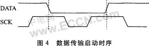 微处理器和温湿度传感器通信采用串行二线接口SCK和DATA,其中SCK为时钟线,DATA为数据线。该二线串行通信协议和I2C协议是不兼容的。在程序开始,微处理器需要用一组"启动传输"时序表示数据传输的启动,如图4所示。当SCK时钟为高电平时,DATA翻转为低电平;紧接着SCK变为低电平,随后又变为高电平;在SCK时钟为高电平时,DATA再次翻转为高电平。