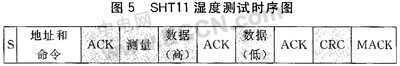 SHT11湿度测试时序如图5所示。其中,阴影部分为SHT11控制总线。主机发出启动命令,随后发出一个后续8位命令码,该命令码包含3个地址位(芯片设定地址为000)和5个命令位;发送完该命令码,将DATA总线设为输入状态等待SHT11的响应;SHT11接收到上述地址和命令码后,在第8个时钟下降沿,将DATA下拉为低电平作为从机的ACK;在第9个时钟下降沿之后,从机释放DATA(恢复高电平)总线;释放总线后,从机开始测量当前湿度,测量结束后,再次将DATA总线拉为低电平;主机检测到DATA总线被拉低后,得知湿度测量已经结束,给出SCK时钟信号;从机在第8个时钟下降沿,先输出高字节数据;在第9个时钟下降沿,主机将DATA总线拉低作为ACK信号。然后释放总线DATA;在随后8个SCK周期下降沿,从机发出低字节数据;接下来的SCK下降沿,主机再次将DATA总线拉低作为接收数据的ACK信号;最后8个SCK下降沿从机发出CRC校验数据,主机不予应答(NACK)则表示测量结束。