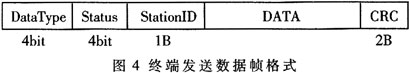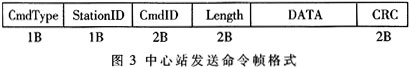中心站发送的命令帧(如图3)包括:命令类型、目的终端号、命令号、命令长度、命令内容及CRC校验,终端根据收到命令帧的CmdType判断是何种指令,例如0x00表示心跳包响应、0x11实时数据查询命令、0x12历史数据查询命令、0x18时钟校对命令等。