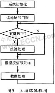 图5为该系统的主循环流程。系统上电以后,首先读取存在EEPROM中的地址和温湿度门限值,然后进入循环状态进行温湿度信号采样,接着对采集得到的数据进行处理并存储,同时在循环中对按键标志位进行判断。如果被置位,则执行相应的按键处理。