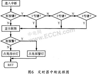 图6为该系统的定时器中断流程。当系统进入中断以后,首先通过判断相应的IO口输入电平是否跳低来判断是否有键按下,如果有键按下,则进一步判断是哪一个键,接着存储该键位并将按键标志位置位。之后再调用显示刷新程序,将最新采集到的数据送到数码管显示。最后判断采集到的数据是否超出门限,并相应点亮指示灯或者报警灯。执行完以上操作后中断返回。