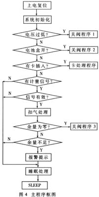 系统软件采用PIC16C5X精简指令集编写。软件设计紧密结合智能IC卡燃气表的控制模式,充分体现了对IC卡信息读写、卡类型判断、计量信号判断与数据处理、电压监测与电源保护等功能,并在IC卡信息安全性、软件运行可靠性及抗干扰等方面进行了精心设计。系统主程序框图如图4所示。