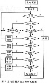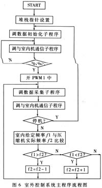 室外机控制系统软件可分为压缩机变频控制模块,与室内机的通信模块和信号采集、控制输出三大模块。其中变频控制软件是室外机控制系统的核心。其主程序流程图如图6所示。