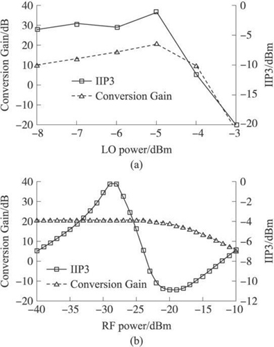 根据参考文献,我们在电路设计过程中做了以下考虑。从转换增益考虑,△VLO必须较小,而βRFN和βRFP必须较大。当βRFN和βRFP大到一定程度时,MRFN 和MRFP 将进入弱反型区,当MRFN和MRFP都处于弱反型区时,转换增益将会急速增加,但是同时,线性度将急剧恶化。幸运的是,我们可以通过增加LO 的功率来同时提高转换增益和线性度。