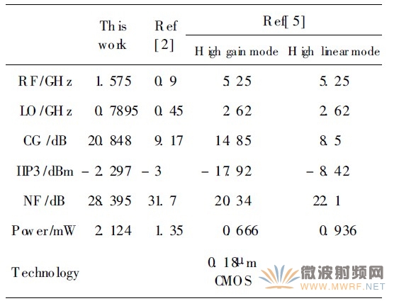 表1给出了本设计的仿真结果与近期发表的论文中混频器电路结果的比较,可以看到,该混频器电路在转换增益和线性度上具有一定的优势。