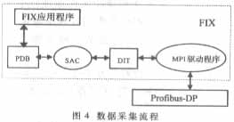 (1)数据流程 FIX运用I/O驱动程序从设备中读写数据,每个I/O驱动程序支持其特定硬件。对于本系统的PROFIBUS网络,采用MPI驱动程序获取其上数据。FIX组态软件首先通过MPI驱动程序软件接口从现场的过程硬件中获取数据,存入DIT驱动程序映象表中(驱动程序映象表在系统运行时实际上是一块内存区),FIX的内部数据库(PDB)通过 SAC程序从DIT表中获取它所需的数据,应用软件(如FIX的画面运行程序、报表生成程序等)都通过内部数据库访问软件从FIX内部数据库中获取来自过程硬件的信息,这样就可以实现在工业流程画面上动态地显示现场各过程硬件的运行状态,数据也可以按相反的顺序写回现场过程硬件,执行控制操作。相应的数据采集流程如图4所示。