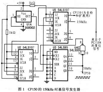 图1中,SG8002是日本EPSON公司生产的可编程晶体振荡器,其频率稳定性为±100ppm/(在-20℃-+70℃范围内)。该编程晶体振荡器产生的1.2MHz脉冲信号经54LSl07双JK触发器4分频后可得到300kHz的方波。此方波输出分两路,一路经54LSl07再次2分频后形成150kHz信号CPl50,作为测试系统的自检、外部检定以及对该测试系统的测试扩展;另一路则先经4位移位寄存器54LS95后,再进行6分频,从而得到所需的50kHz时基信号CP50。