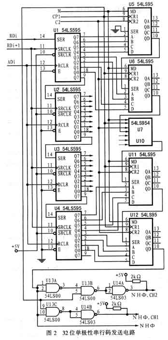 32位单极性串行码发送电路的主要作用是将PC/104总线的数据端口D0-D7送出的串行TTL电平经54LS595移位锁存至54LS95移位寄存器的Di输入口,然后在并行置入脉冲C2下降沿的作用下打入到Qi输出口,最后在32个串行右移脉冲CP1下降沿的作用下形成所需的、含有特定意义的32位单极性双通道串行码NHΦ.CHl和NHΦ.CH2。具体的电路实现原理如图2所示。