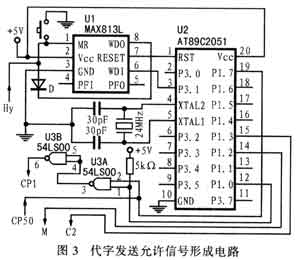 图3中,MAX813L芯片用于组成AT89C2051微处理器的复位监控电路,同时此芯片也可充当"看门狗"(WatchDog),以防止程序运行时出现"飞跑"现象。50kHz的时基信号经过AT89C2051的隔段取样例程后可形成满足图4所示时序要求的采样脉冲串CPl、C2及M。
