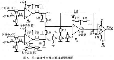 单/双极性变换电路主要是由电平匹配器1、电平匹配器2、反相加法器以及功率放大器等4部分组成,具体的电路原理如图5所示。