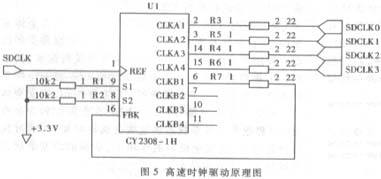 其次是对系统中高速时钟信号与关键信号进行完整性设计。与SBSRAM接口的时钟高达167MHz,与SDRAM接口的时钟高达80MHz,时钟信号传输延迟大小和信号质量的优劣将直接关系到系统的定时是否准确。在设计布局布线时,总是优先考虑这些重要的时钟线,即通过规划时钟线,使得时钟线的连线远离其它的信号线;连线尽量短,并且加上地线保护。本系统中由于要求大量存储器(使用了4片SDRAM),对于要求较高的同步时钟来说,如果采用星型布局,就很难保证时钟的扇出能力,而且还将导致PCB布线尺寸的增大,从而直接影响信号完整性。因此很有必要采用时钟缓冲器来产生4个同相的、延迟极小且一致的时钟,分别接到4片SDRAM上,这样不但增加了时钟信号的驱动能力,同时很好地保证了信号完整性(如图5所示)。对于其它的关键信号诸如FIFO的读写信号等,也应尽心设计。