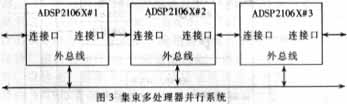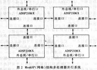 ADSP2106X提供了强大的实现多处理器并行处理的能力,允许某一处理器直接访问其它处理器的内部双口SRAM,并且这种访问一般不影响被访问处理器的工作,片内的分布总线仲裁逻辑可直接管理6片ADSP2106X和一个宿主机组成的并行系统的信息交换。另外ADSP2106X还具有6个4bit的连接口(Link Ports),每个连接口可以两倍于系统工作时钟的速率传送数据,因此每个连接口在一个时钟周期内能够传送一个8bit数据。在多处理器应用中,ADSP2106X通过其6个连接口实现处理器之间点到点的通信。由ADSP2106X构成的典型多处理器并行系统主要有以下三种形式:共享总线的多处理器并行系统;MeshSP(网格)结构多处理器并行系统;集束多处理器并行系统。