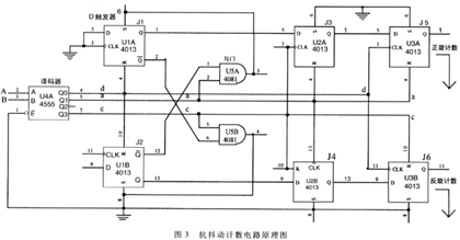 例如在图2中,当从状态d进入状态a时,正旋标志送到J3的D端。此后的a、b、a、b、a、b都不起作用,只是把J3和J5反复清0。当从状态b进入状态c时,正旋标志送到J5的D端。当从状态c进入状态d时,正旋标志送到正旋计数输出端,同时J1和J2被清零。在从状态d进入状态c后,反旋标志送到J4的D端。同时,D=0被打入J3的Q端,这时J5的D端为零。在从状态c回到状态d后,反旋计数权被释放。但是,由于J5的D端为零,虽然这里再次出现状态d,该d脉冲不会发生计数,这就是抗抖动。