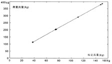 在实际应用中,首先通过实际测量标定,对相位差与流体流速以及周期与流体密度运用最小二乘法进行线性拟合以得到它们之间的关系式作为计算质量流量的数学依据。实际流量值与计算值存在对应关系。以累计时间为30秒对流量值进行标定,并与仪器测量值进行比较,得到其对应关系如图5所示。由此得到校正关系式为: