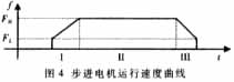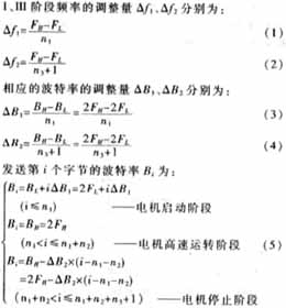 由图4所示的电机运行过程可知,在电机运行过程中,控制脉冲的频率f应随时变化以满足电机低速起停及高速运行的需要。脉冲频率由发送数据的波特率(B)决定,每发出一个脉冲需用两个二进制位1和0来构成其高、低电平,所以f=B/2,通过调整发送数据的波特率可改变所发出的控制脉冲的频率。按常规波特率系列发送数据时所产生的控制脉冲频率变化较大,不能满足电机正常起停及调速的要求,为此计算机需按非标准的波特率发送数据以产生任意频率的控制脉冲。一般在电机起动及停止阶段(I、III)每发送一个字节调整一次波特率,以使电机起停得尽量平滑。