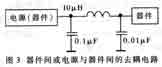 在一个电子系统中,通常多个器件共用一个电源。而电源线给交流信号提供了一个通路,使得交流信号通过电源线在器件之间传输,形成了干扰。所以必须在器件之间和电源到器件之间的电源线上加入滤波部分,滤掉交流干扰,称为去耦。电源的去耦通常用几个并联电容和串联电感来实现,如图3所示。