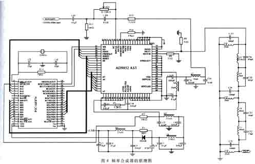 由于采用了参考信号单端输入的方式,所以REFCLKB端应该接地或电源;参考信号输入端REFCLK要跟电源相连接。因为DDS的参考信号要求有1.6V的直流电平,在参考信号输入到REFCLK端的端点处,应接一个5.1kΩ的电阻到3.3V直流电源,同时接一个0~10kΩ的可变电阻(此处取5kΩ)到100Ω的电阻,经过电阻分压,REFCLK端就有1.6V的直流电压。这个0~10kΩ的可调电阻同时用来微调REFCLK端对地的电阻,以调节REFCLK的直流电位,具体情况请参看图4。图4中的∏形滤波部分是为了滤除电源对REFCLK端的干扰。该频率合成器原理图如图4所示。