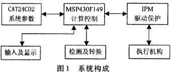 系统的硬件构成如图1所示,输入及显示电路完成人机交互功能,对电梯门机的执行过程进行设定;计算控制电路根据设定参数和外部输入的信号,依照一定的控制规律,完成计算及控制逻辑输出;而驱动和保护电路接受计算控制电路的控制逻辑,根据此逻辑控制执行机构的动作,同时监控自身及执行机构的状态,在发生故障时保护电路动作,以保护元器件安全。下面简要介绍计算控制电路和执行机构。