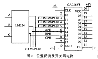 位置反馈及开关译码电路 电路如图2所示。A,B,C三相位置是由3个互差120°电角度的光电传感器送出的方波信号,经过LM324整形后,送人MSP430F149进行最优电流导通角处理,处理后输出的3个互差120°电角度的方波信号送到GAL16V8进行开关译码。GAL16V8同时将译出的控制导通信号与PWM调制信号、故障排锁信号、电机正反转信号一起译码,实现电机转速、方向控制和故障保护功能。