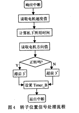 电机控制和驱动程序主要完成电机运行速度曲线的处理、最优电流开通角的即时计算。程序在调速时,将所得电机实际转速与默认数据进行比较,然后对实际转速进行调节。为了减弱转矩脉动,需要对转子位置信号进行一定角度的偏移处理,系统中,经过对电机电流信号的计算,使用了3°角的最优电流开通角。电机的转子位置信号引起MSP430F149的中断,在中断处理程序中,MSP430F149先根据送人的电机实际转速信号计算出3°角所需时间,然后按照电机运行方向信号,对位置信号进行超前或者滞后处理。退出中断后,Timer-B依照计算结果,输出新的三相位置信号给GALl6V8译码器,由GALl6V8输出开关信号,控制逆变器的工作状态,从而控制电机的运行速度。程序流程图如图4所示。