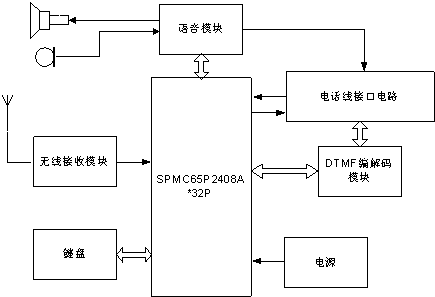 系统硬件框图如图 1所示。本方案选用SPMC65P2408A*32P单片机作为控制器的处理器,其加上一些外围器件,构成最小系统,完成主控器的控制功能外,还完成了主控器中所有的语音功能。